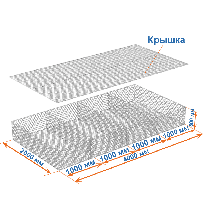 Габион матрац ГСИ-М 4х2х0,5 оцинкованный, Ø проволоки 2,4мм, размер ячейки 6х8 см