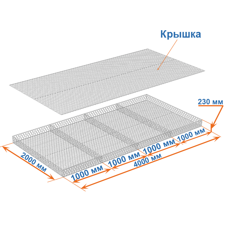 Матрасы Рено 4x2x0,23 — плоские габионные секции из сетки двойного кручения с ячейкой 80х100, проволокой 2,7 мм и покрытием Цинк.
