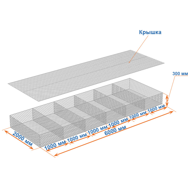 Габион матрац ГСИ-М 6х2х0,3 оцинкованный, Ø проволоки 2,7 мм, размер ячейки 6х8 см