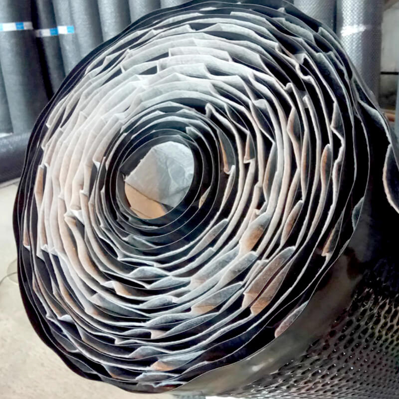 К поверхности геомембраны прикреплен слой геотекстиля, он служит для первичного сбора и отвода влаги. Геотекстиль собирает влагу и отводит ее по дренажным каналам профилированной геомембраны Geo.